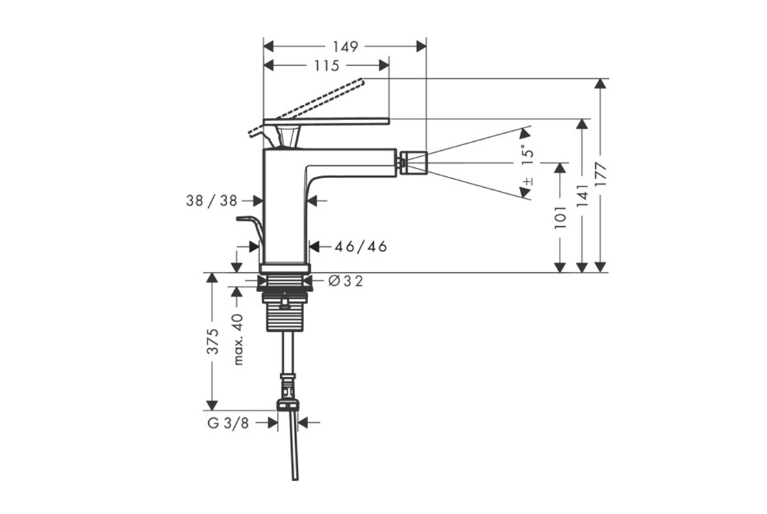 складається з: одноважільного змішувача для біде, зливного комплекту pop-up,проекція: 149 мм,висота носика: 101 мм,тип розпилення: ламінарне,керамічний картридж,підходить для безперервних проточних водонагрівачів,тип з'єднання: G ⅜,приєднувальний розмір: DN15.