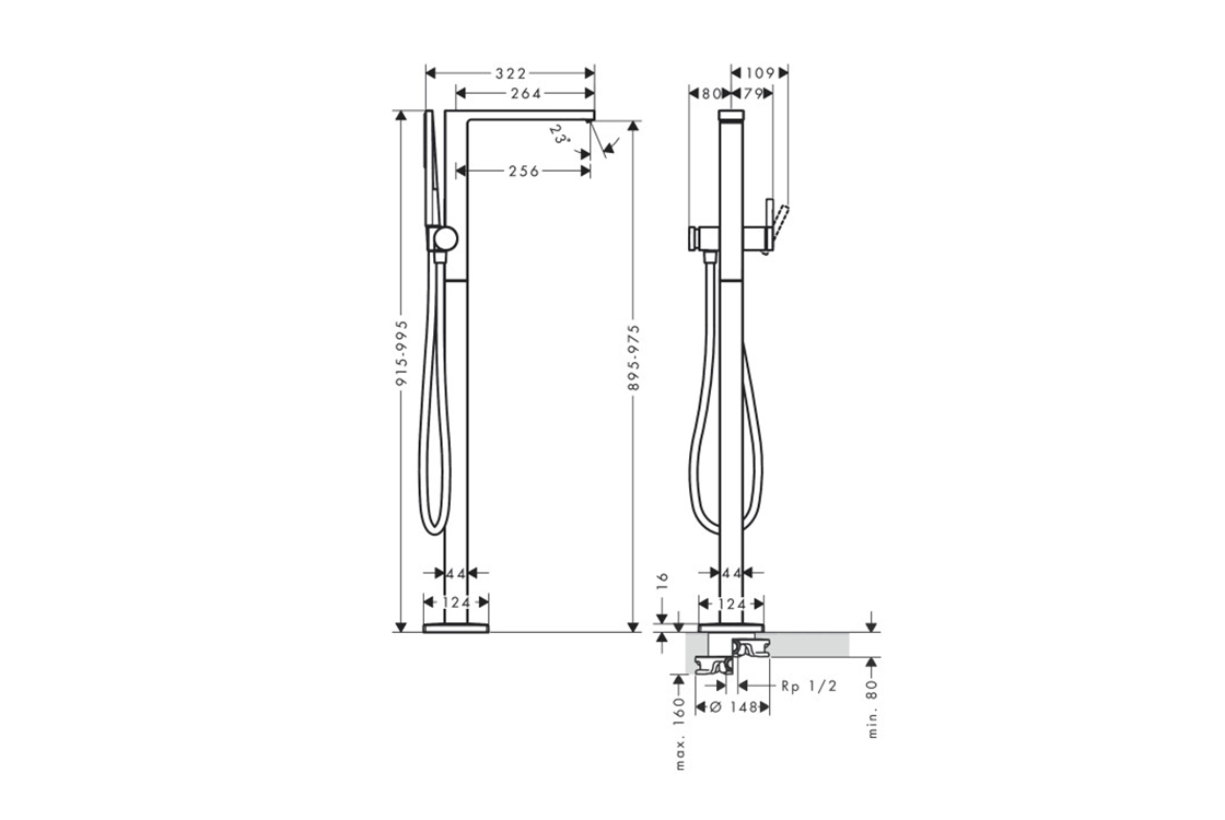 складається з: одноважільного змішувача для ванни підлогового типу, ручного душу, душового шланга, тримача для душу,2 функції,проекція: 194 мм,змішувач розпилювального типу: WaterfallStream,ручний душ типу розпилення: PowderRain,керамічний картридж,регулюється обмеження температури,перемикач тиску Select з автоматичним скиданням,приєднувальний розмір: DN15,тип підключення: базовий комплект,макс. робочий тиск: 10 бар,необхідне додаткове обладнання: прихована частина для підлогового змішувача (арт.10452180) (не входить в комплект).